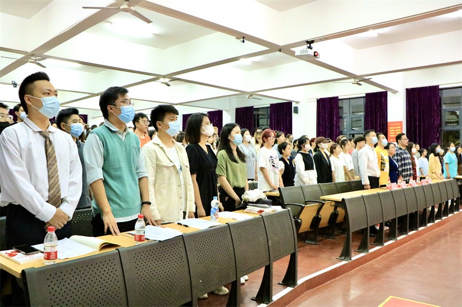 开班典礼在庄严的国歌中正式拉开序幕,与会全体成员起立,奏唱国歌。学员代表播音专业2102班的张洲上台发言,她号召同学们严格要求自己,遵守纪律,主动完善自己,逐步向党组织靠拢。
