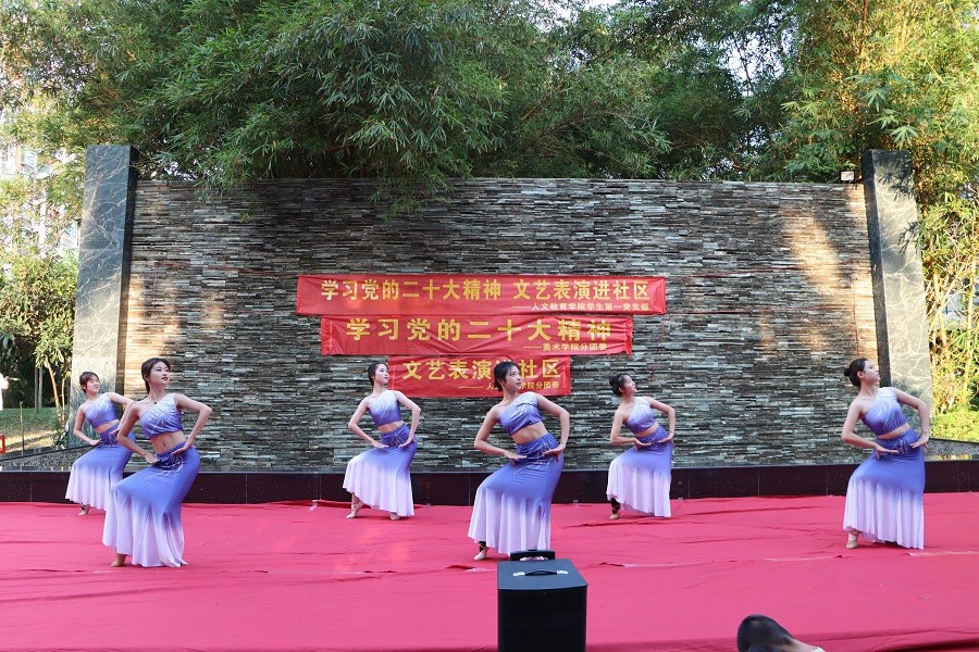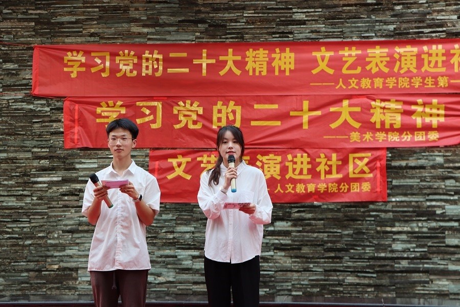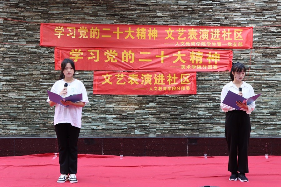 本次活动由人文教育学院党员、师生共同参与,通过发挥学院师生的专业特长,以歌舞、戏曲、朗诵等老百姓通俗易懂、喜闻乐见的文化艺术表演形式,向社区群众宣传党的二十大精神,唱响时代主旋律,进一步激励广大人民群众坚定不移跟党走,为新时代幸福生活接续奋斗的理想信念。