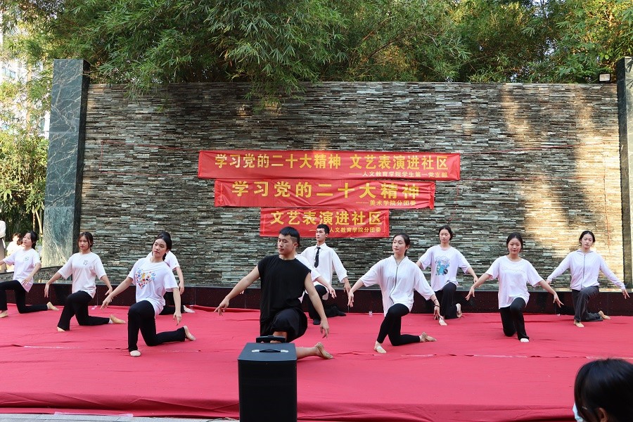 为深入学习党的二十大精神,10月28日下午,我校人文教育学院学生第一党支部和人文教育学院分团委协同合作在橄榄苑小区举办了“学习党的二十大精神,文艺表演进社区”主题党日活动。