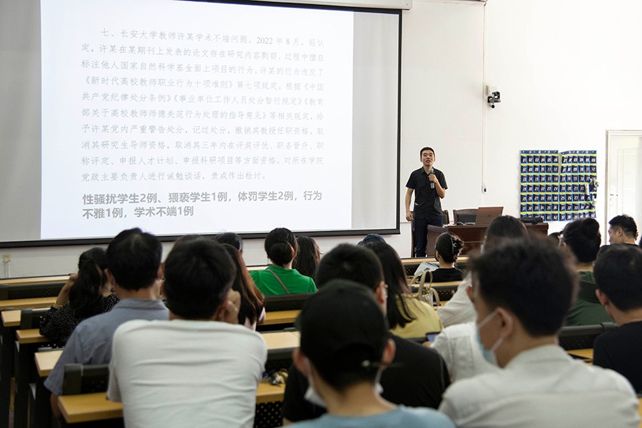 接下来就“教育部公开曝光第十二批7起违反教师职业行为事项准则典型案例”逐一为广大教职工展开讲解,并举一反三,结合我院各项教育教学工作以及具体的岗位职责为对案例进行深入剖析。并要求全体教职工务必确保:知准则、守底线,自律自强,践行良好师德,树立良好师风学风。如有师德违规行为学校将予以从严处理,对情节严重、影响恶劣的教师,将依法依规撤销教师资格,列入教师资格限制库,清除出教师队伍。