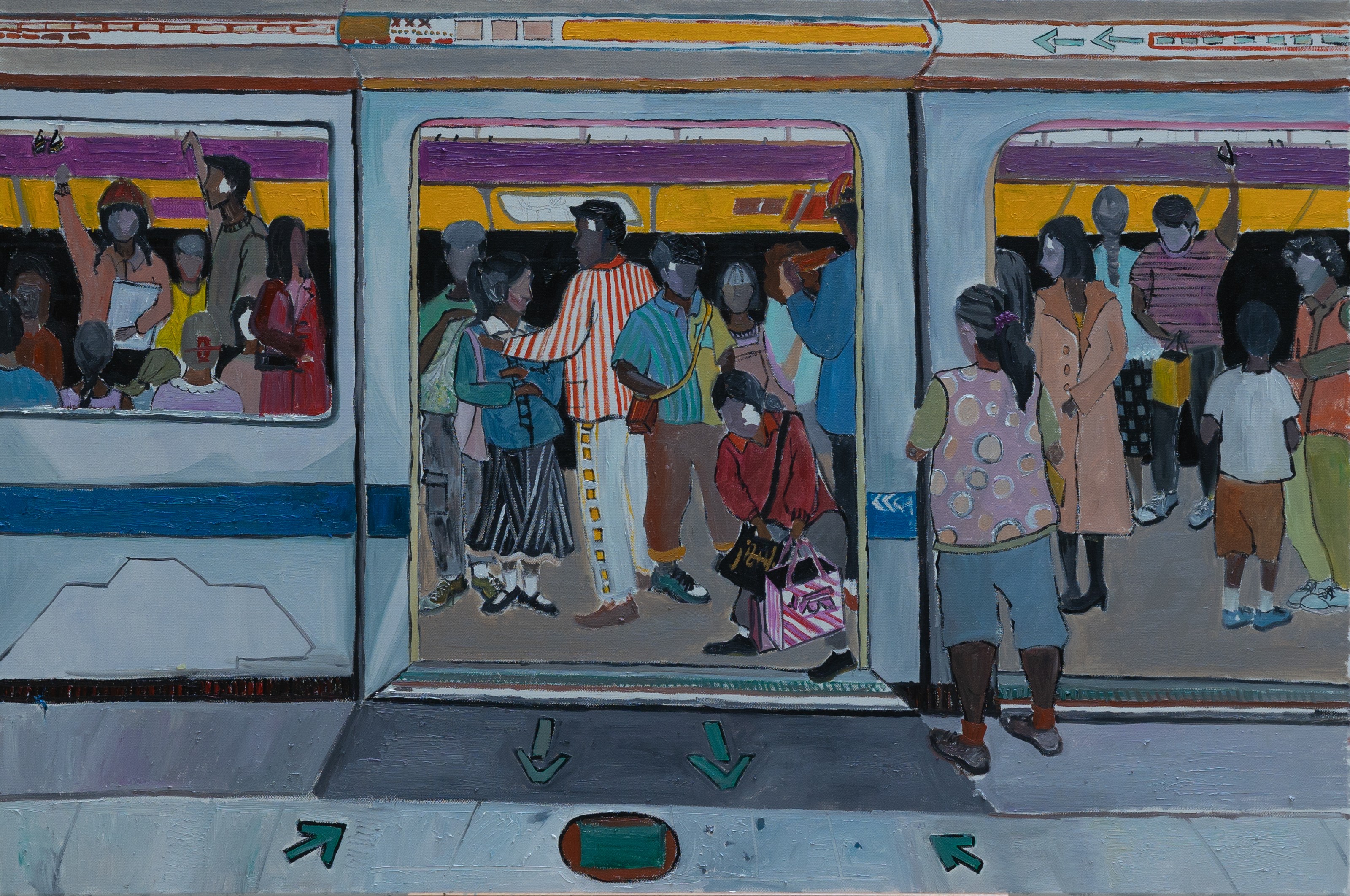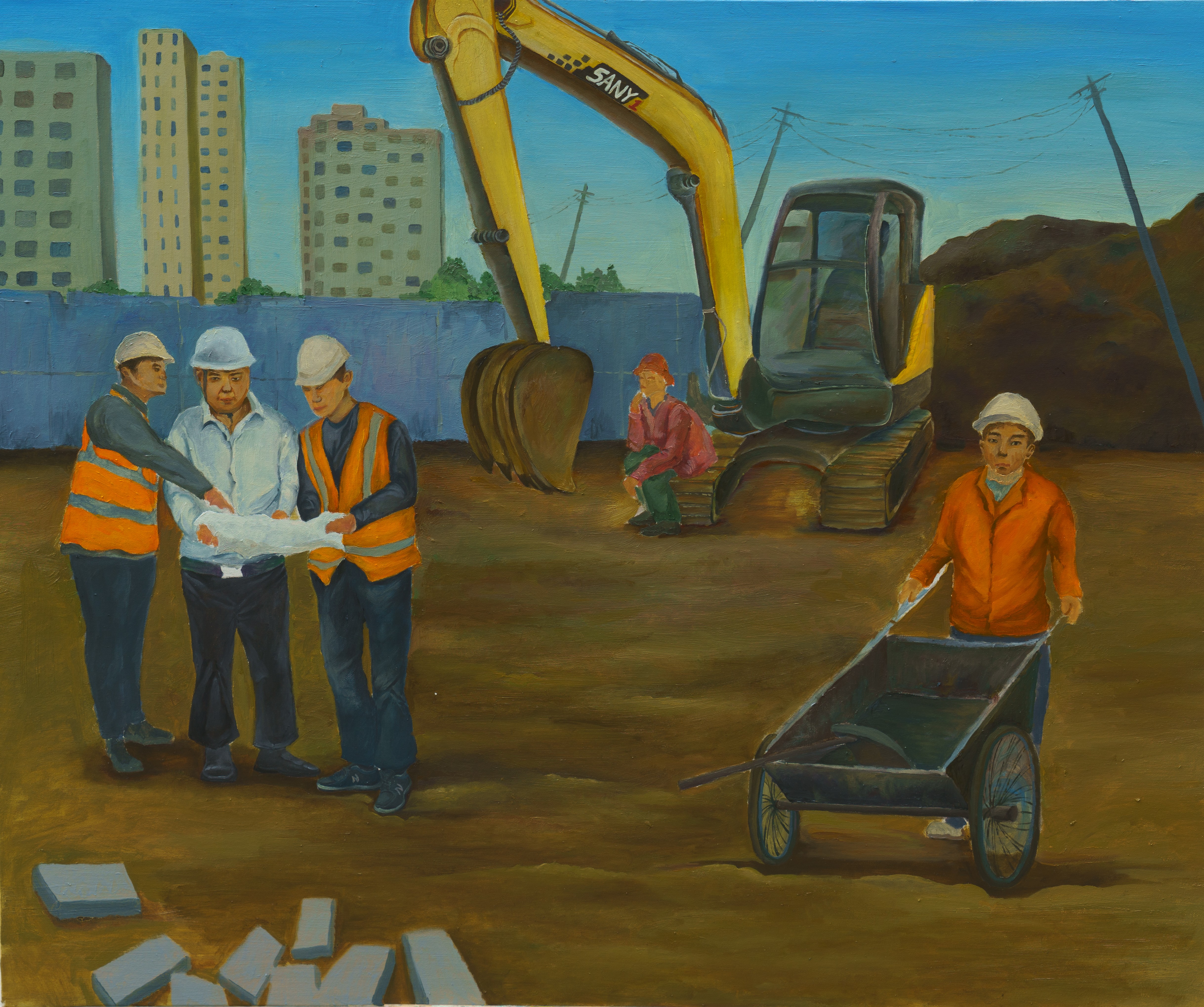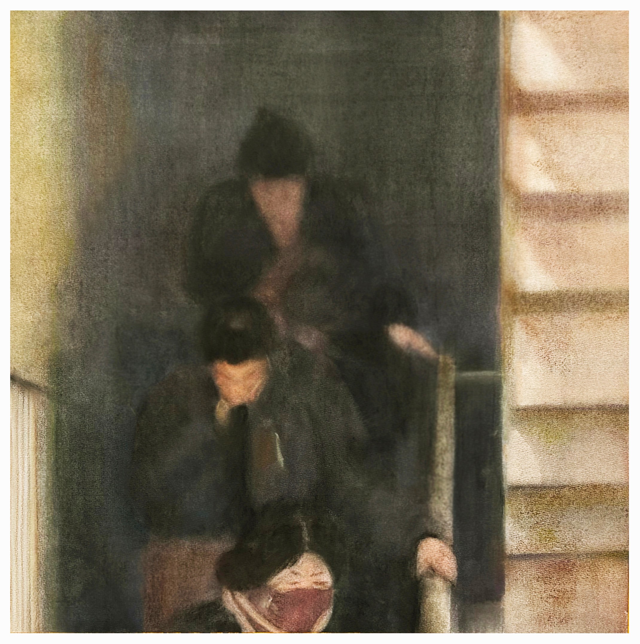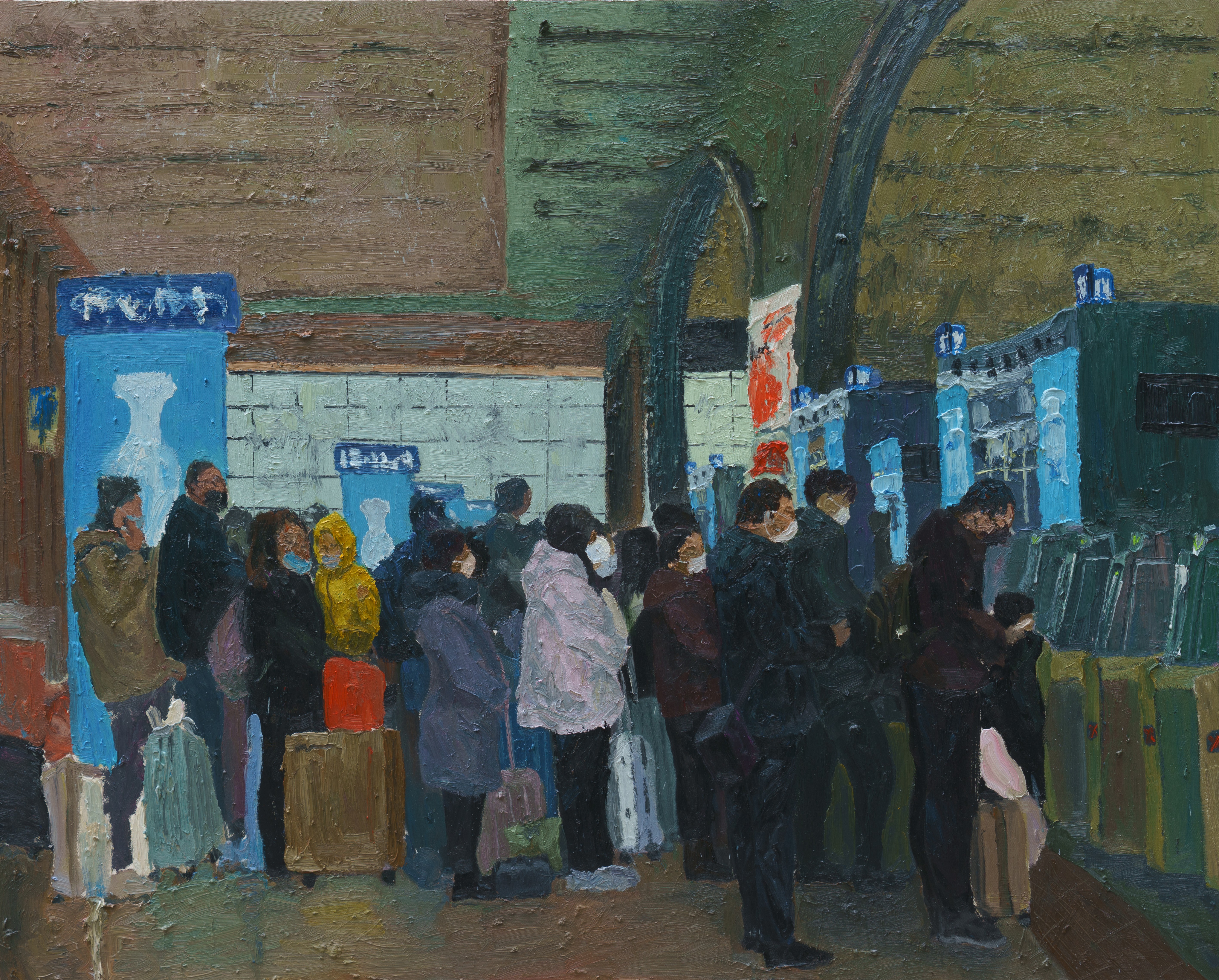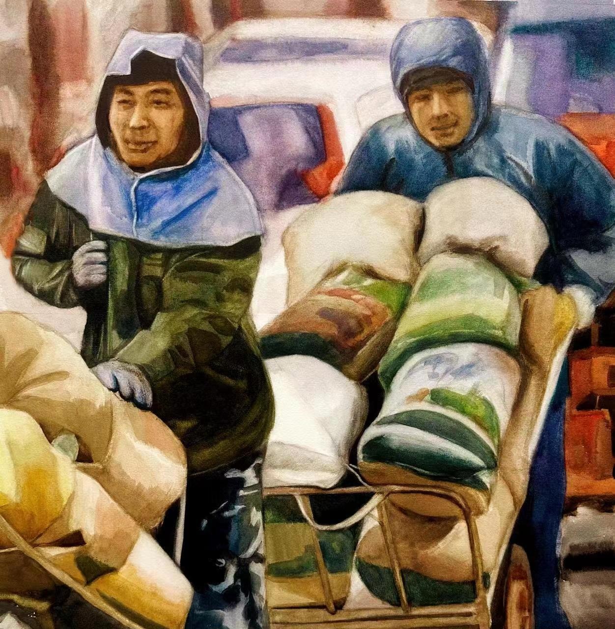 杨圆缘《进城的农民工》  52cm×52cm 2023年 纸本水彩