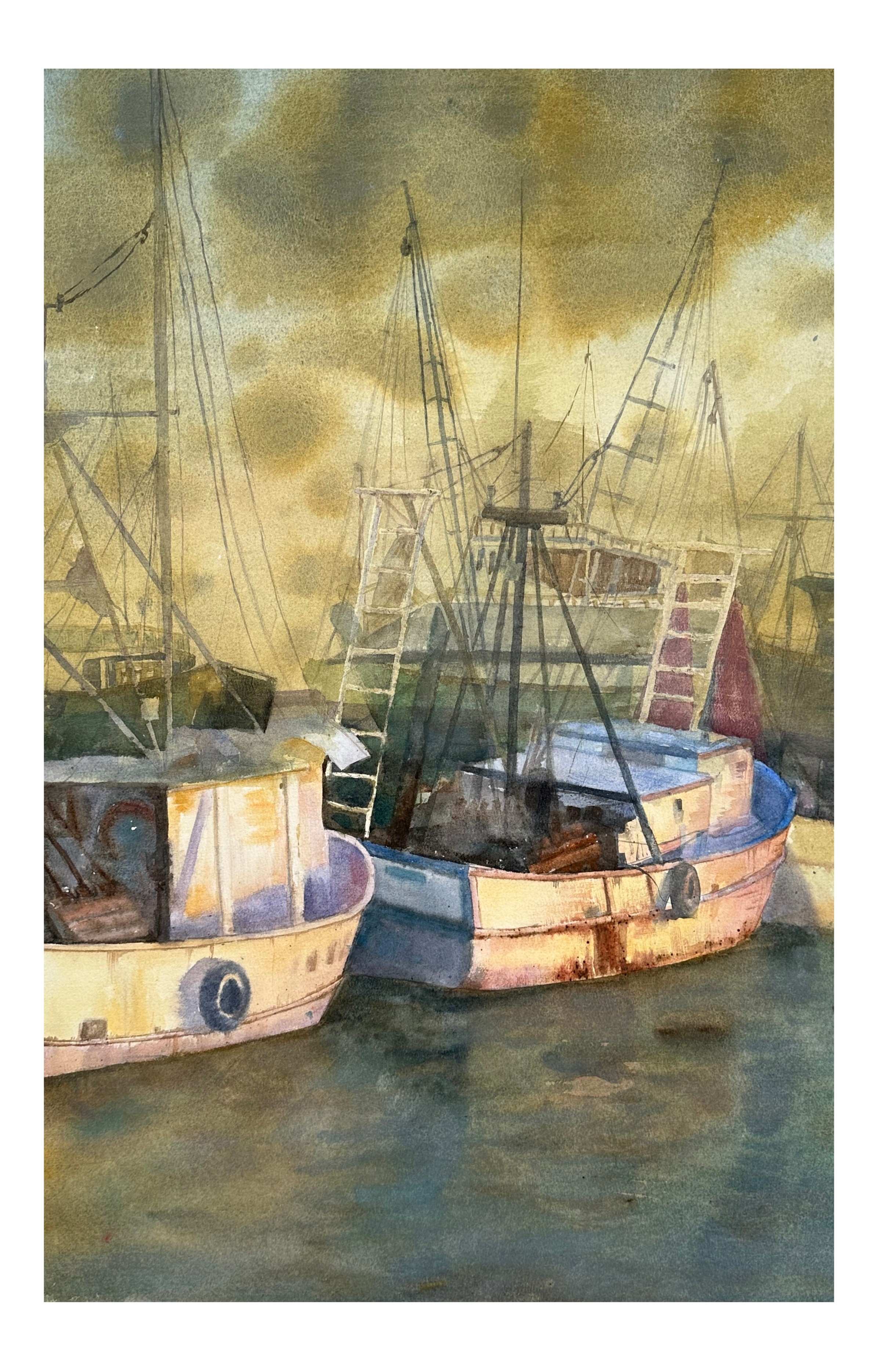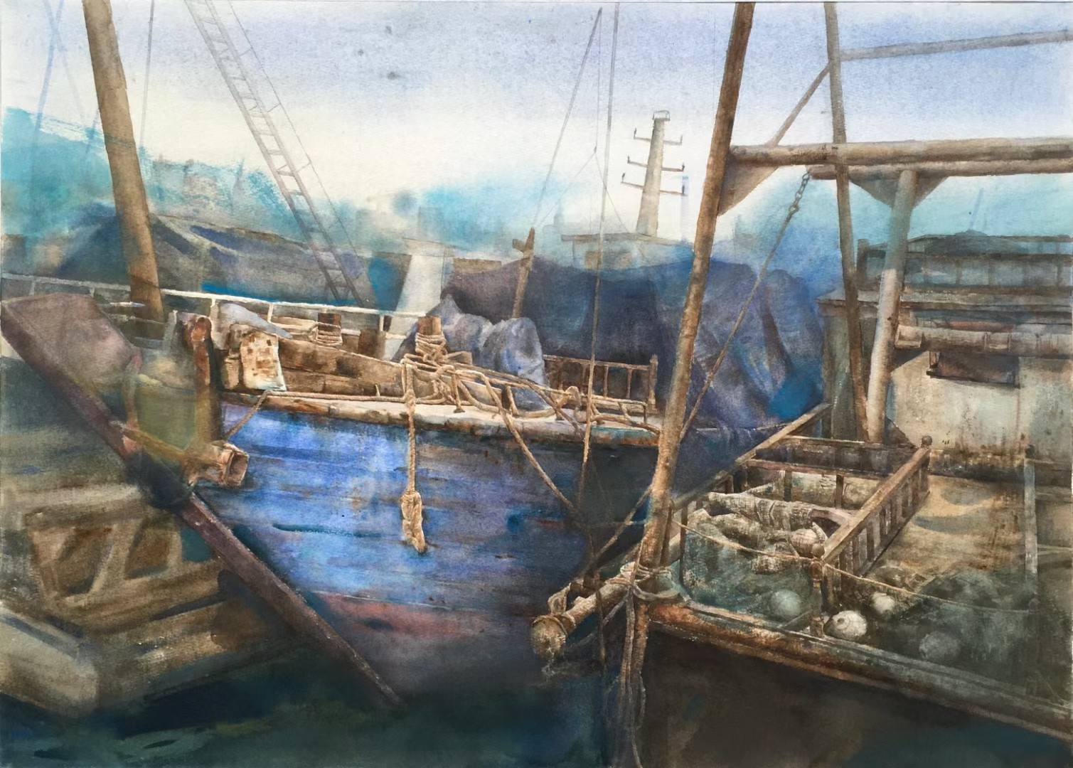 梁晓明《休渔时节》  50cm×55 cm  2023年 纸本水彩