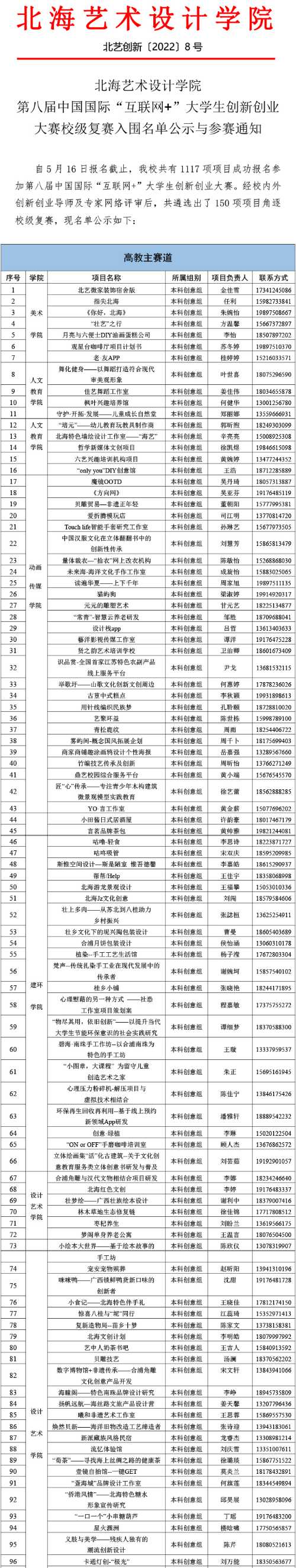 北海艺术设计学院第八届中国国际“互联网+”大学生创新创业大赛校级复赛入围名单公示与参赛通知