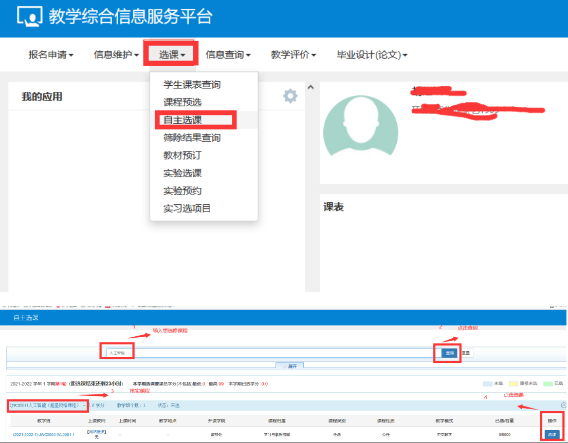 用浏览器打开北海艺术设计学院教务处网站https://jwglxt.sszss.com:8443/jwglxt/xtgl/login_slogin.html(推荐使用IE、QQ或360浏览器);依次点击“教务管理系统(学生入口)”——输入用户名和密码登录--点击“选课”--“自主选课”--“查询”等(可以跨校区选课)--“选课”。