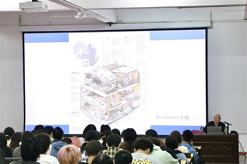 紧接着,贾荣建教授以AI绘画和AI融入工业设计的案例阐述了在人工智能的背景下,工业设计的新机遇和发展空间。他表示AI的出现并不是取代工业设计,而是让大家在工业设计时更加便捷,它简化了设计工序却也增强了设计的创新空间。贾荣建教授鼓励广大师生不要抵触AI创作,而是应该灵活利用,积极看待事物的发展。