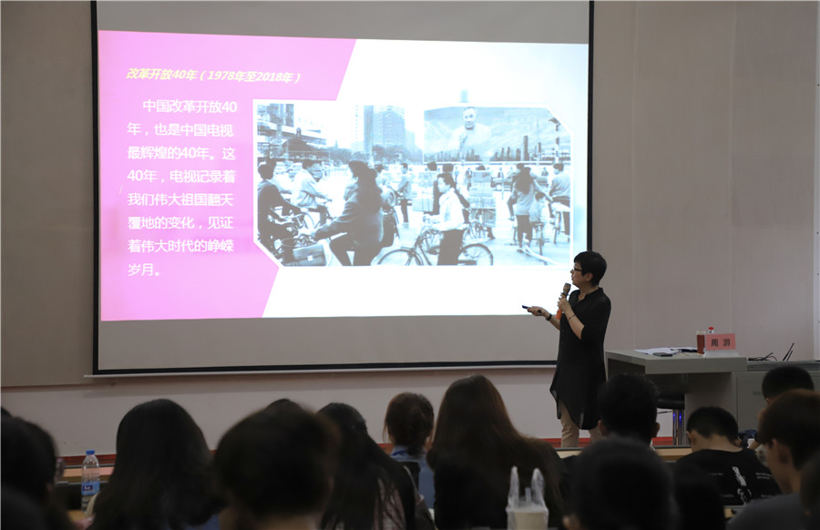 讲座过程中,周游教授以赵忠祥为例,向同学们介绍了改革开放后的新时代播音员。让同学们认识到除了播报形式有所变化,我国更推出了《动物世界》等配音类电视纪录片,这类节目大多集知识性、趣味性为一体,传递欢乐的同时,也向全世界人民介绍着新中国的发展。