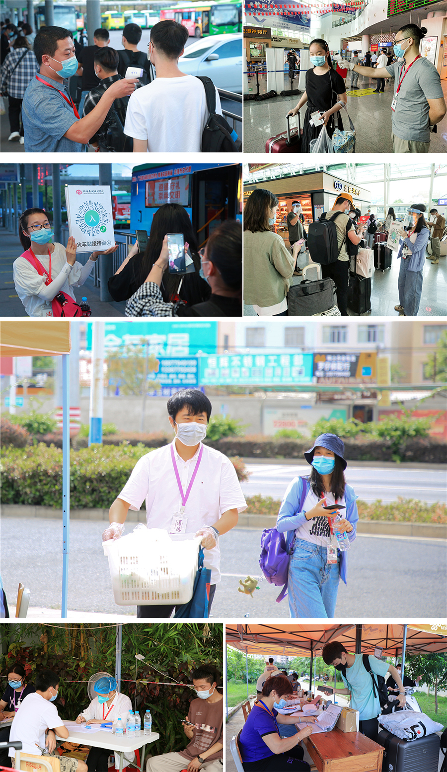 学生在火车站、机场进行测温、扫码、核验身份、排号入座,由专车送到校后再逐项完成校内报到流程。整个接待过程中,严格实行执行“点对点”闭环管理,各工作组密切配合,有条不紊完成各项接待工作。