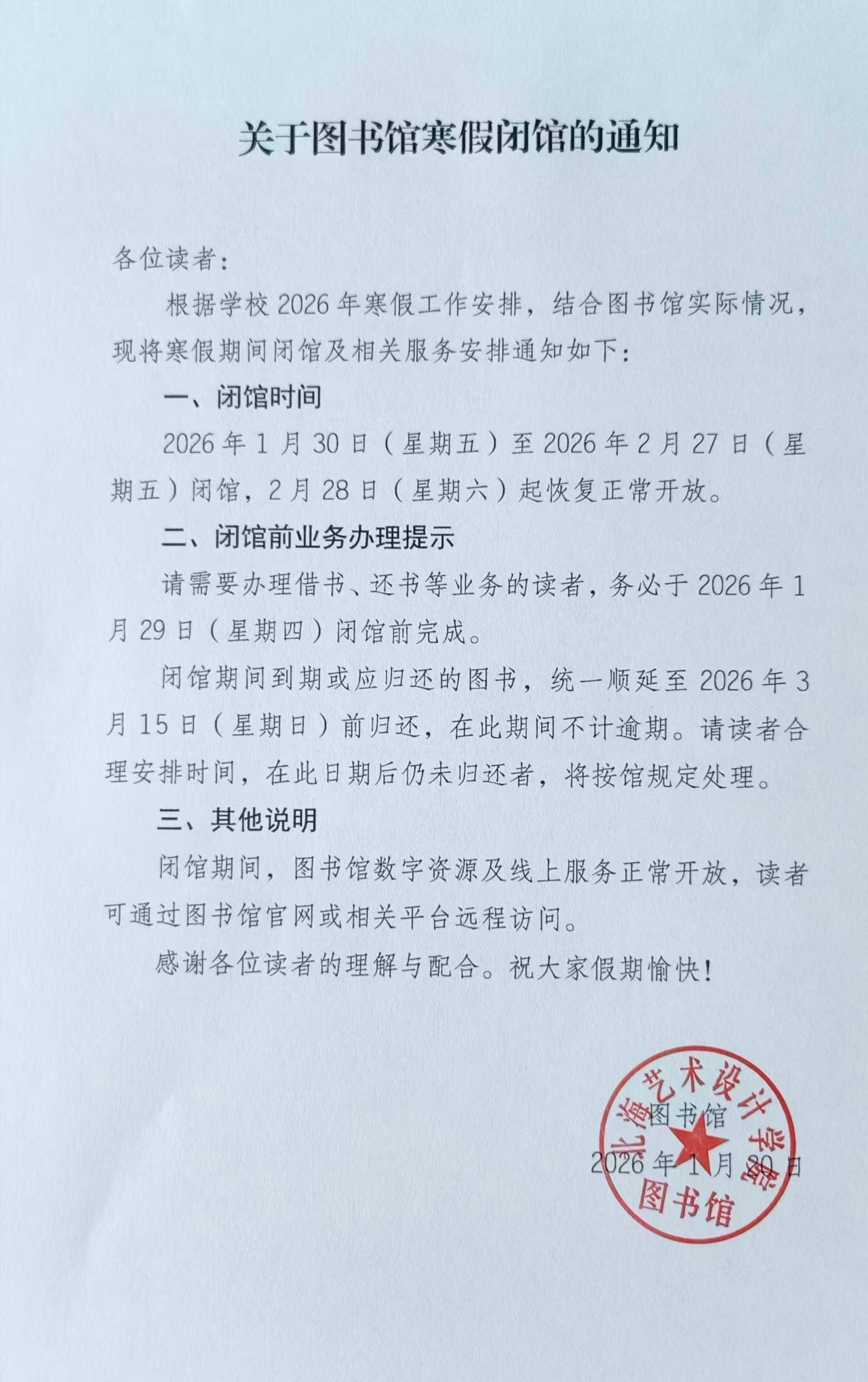 关于图书馆寒假闭馆的通知