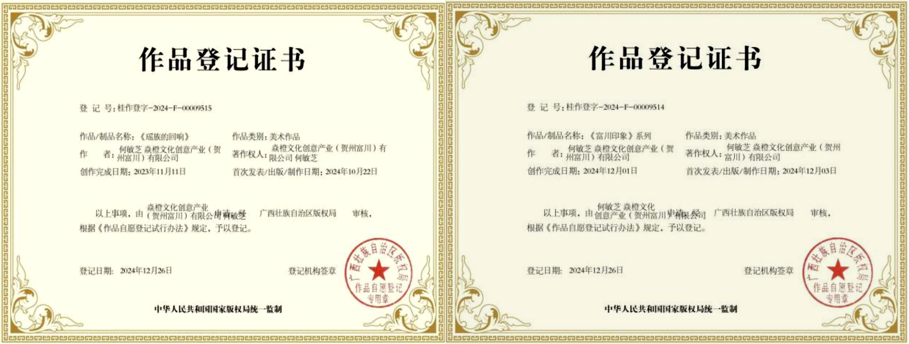 师生团队深度挖掘蝴蝶歌、长鼓舞等 10 余项非遗元素,完成《瑶族的回响》《富川印象》系列美术作品版权登记,开发瑶族小女孩 IP 形象体系,将盘王印、龙犬图腾等符号融入明信片、钥匙扣等 100 余类文创产品,实现 "非遗符号 - 创意设计 - 实用商品" 的转化。其中二维动画《远古的回响》带动衍生产品开发,形成文化传播与产业开发的良性互动。