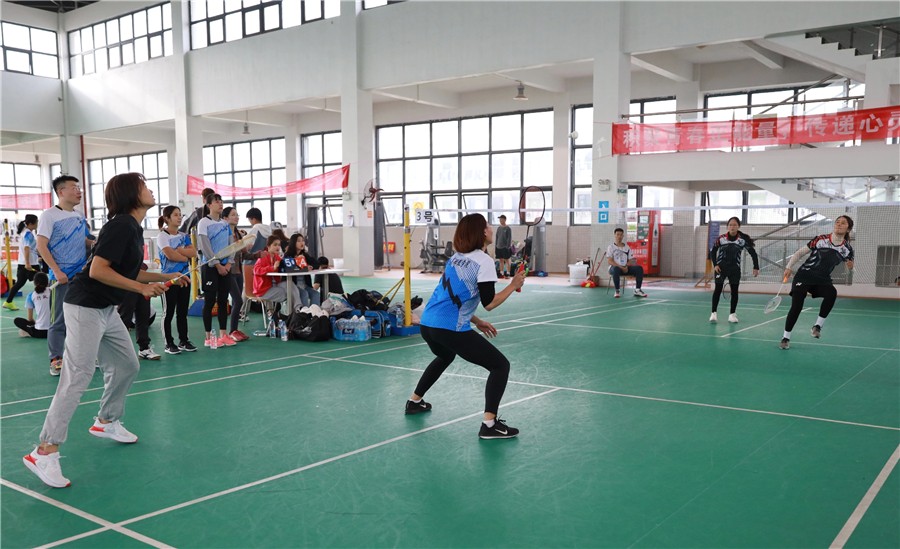 下午的羽毛球比赛分为女双、男双、混双、采用三场二胜制,每场为三局二胜制比赛分两个阶段进行,第一阶段两个小组进行单循环赛决出名次,第二阶段由小组赛前两名交叉进行,最后的决胜阶段比赛异常精彩,双方稳扎稳打,运动场上加油声、欢呼声、赞叹声、欢笑声此起彼伏。