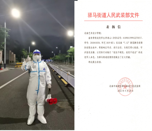 2022年7月12日,北海突发疫情,李清山积极响应政府的号召,主动请缨,参加抗疫志愿服务工作,在高风险区域负责医疗物资发放、核酸点秩序维持、发放物资等工作,勤勤恳恳,任劳任怨。