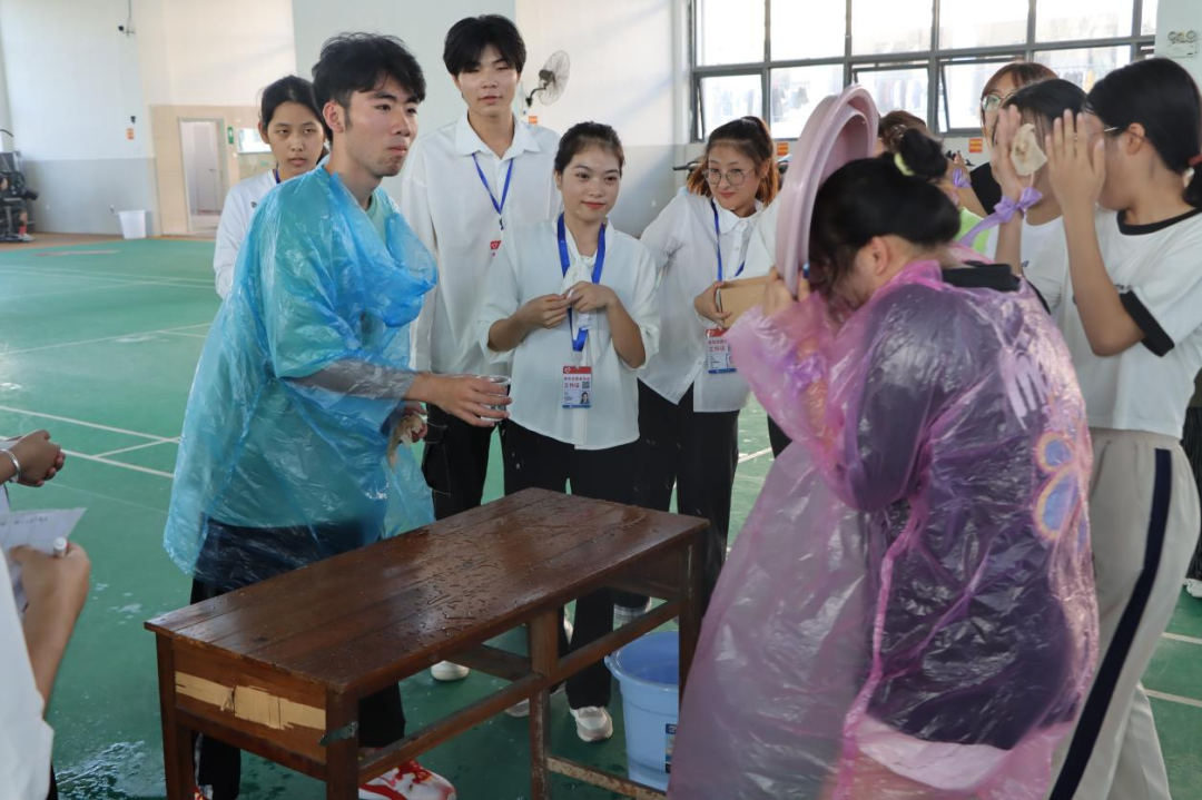 每两组进行比赛,比赛前可穿上提供的一次性雨衣,然后每组人轮流上场答题,由工作人员进行消防知识提问,并在说完开始答题后两人可进行抢杯泼水,抢到杯子的同学进行回答,答对加一分,答错则把水杯给予对手。游戏五安全保龄球: