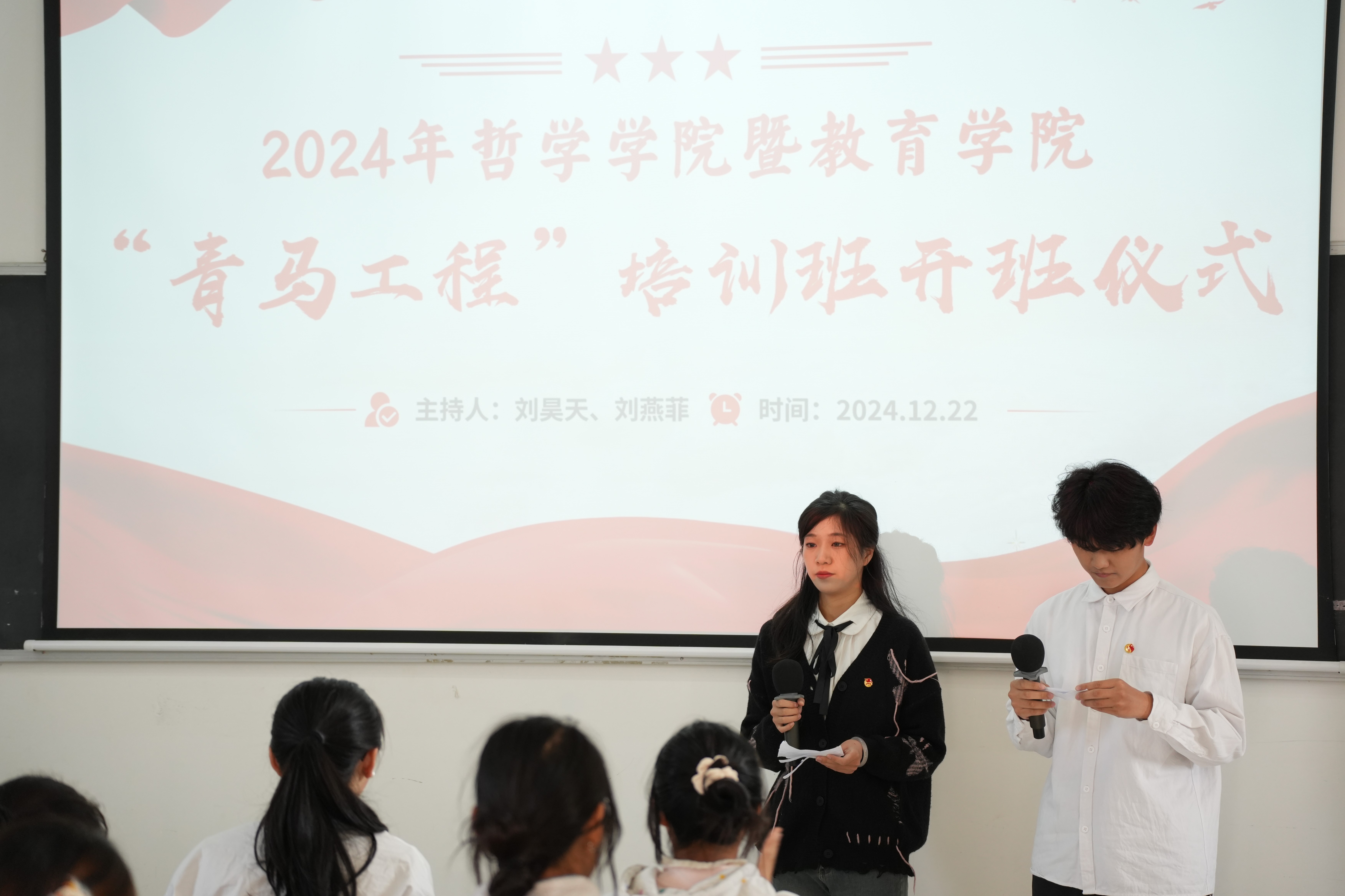 主持人刘燕菲、刘昊天宣布开班