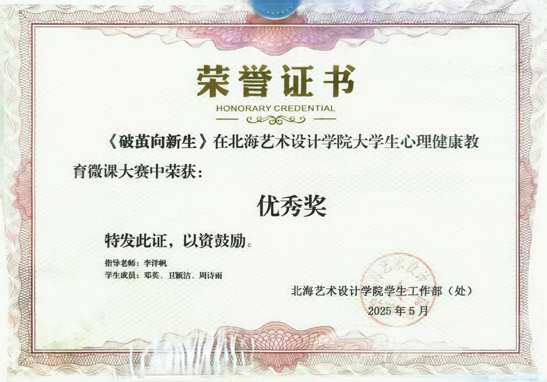 2025年5月 参与的微课《破茧向新生》在“北海艺术设计学院大学生心理健康教育微课大赛”中获优秀奖;
