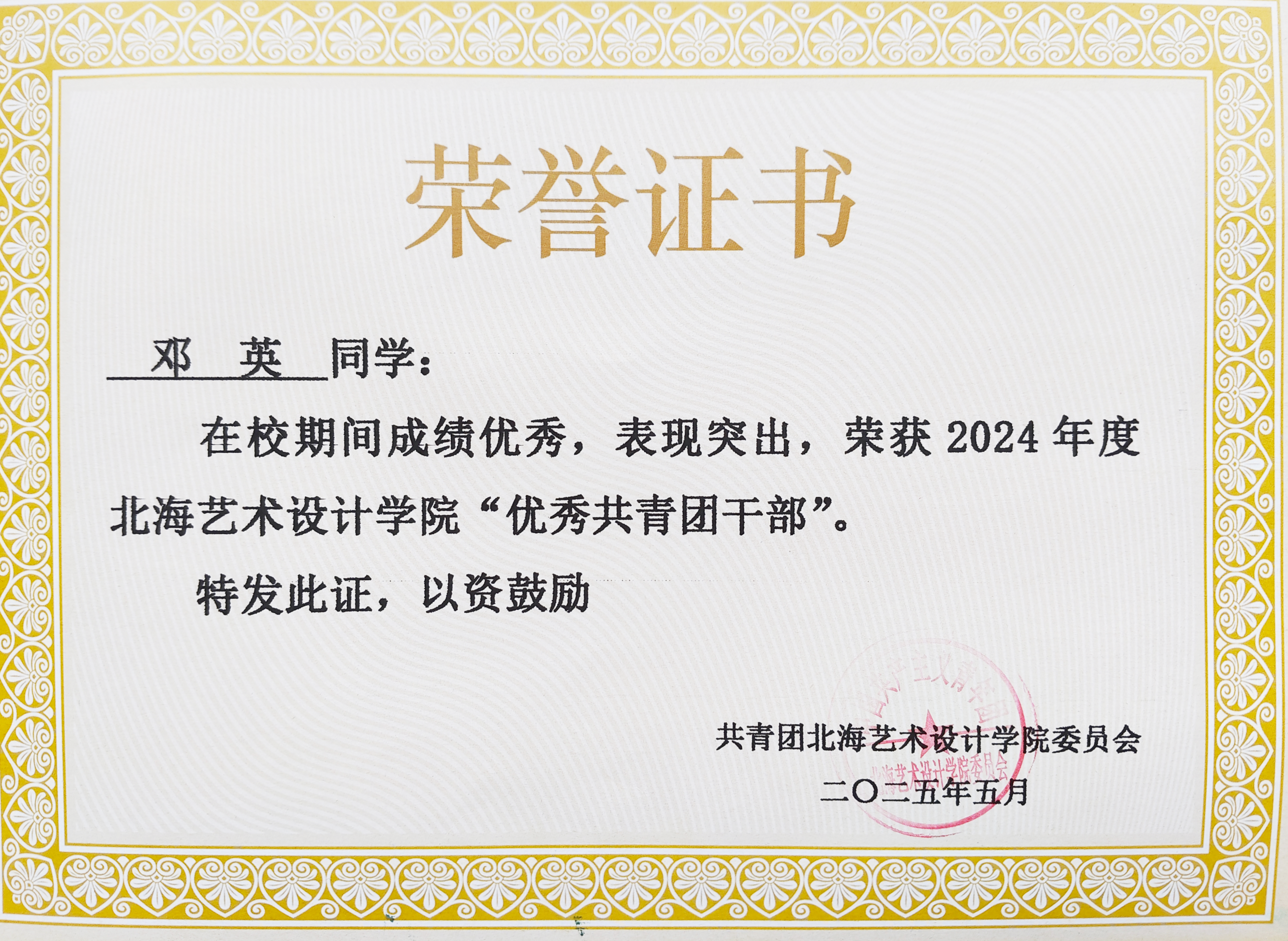 2025年5月 获2024年度北海艺术设计学院“优秀共青团干部”称号;