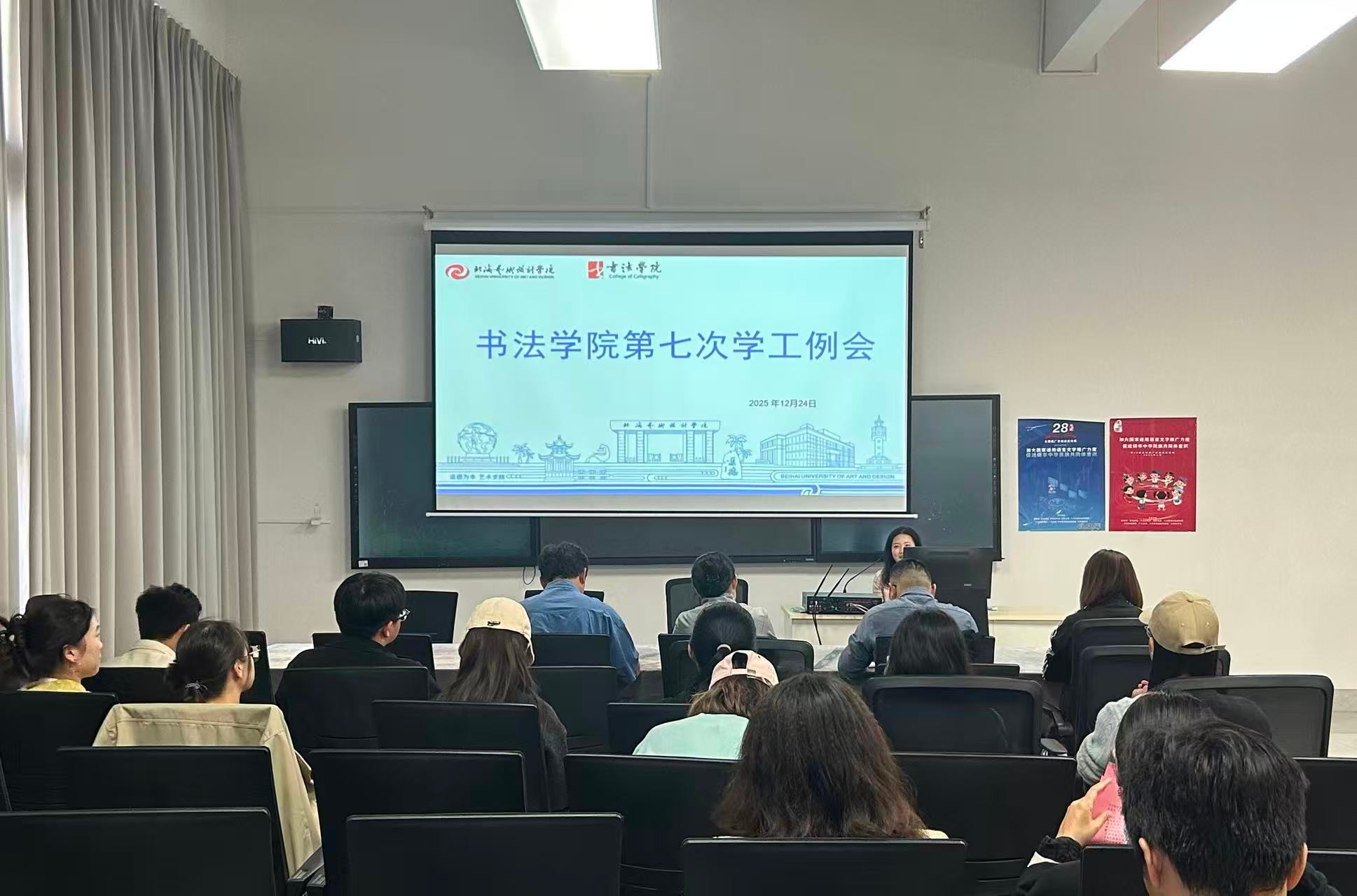 为系统复盘年末学生工作成效,统筹部署期末及寒假重点任务,筑牢育人安全防线,12月24日下午,书法学院学工办在艺德楼507教研室组织召开第七次学生工作会议。党支部书记喻广林、副书记左云飞,学工副院长李家琪、黄荣婷、韦志忍,及全体学工教师、辅导员参加此次会议。会议由学工办主任胡慧捷主持。