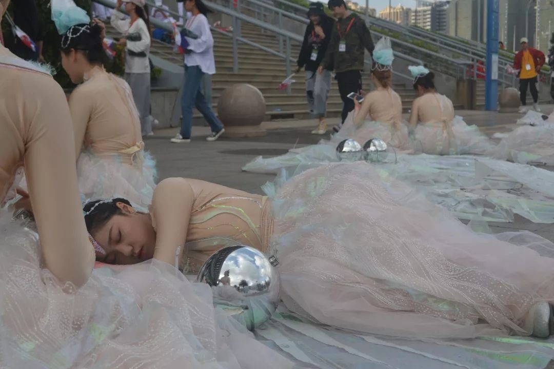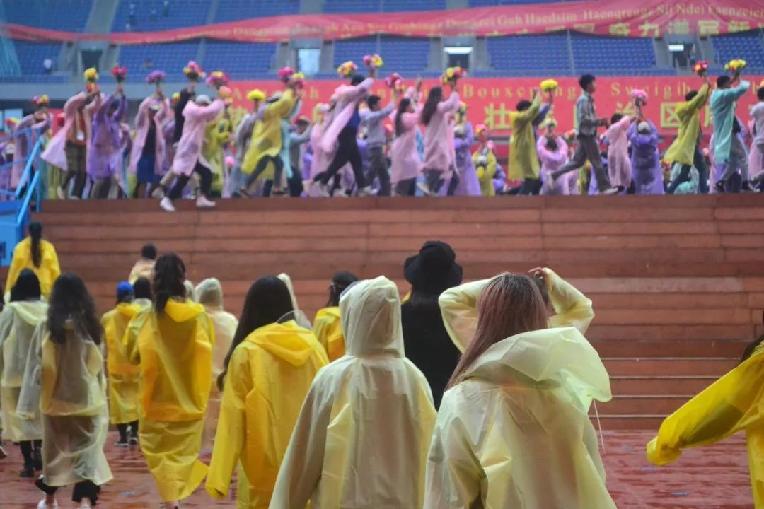 演出前一周,全广西气温骤降,不时伴着小雨。同学们不怕艰辛,听从导演组指挥,按质完成训练。