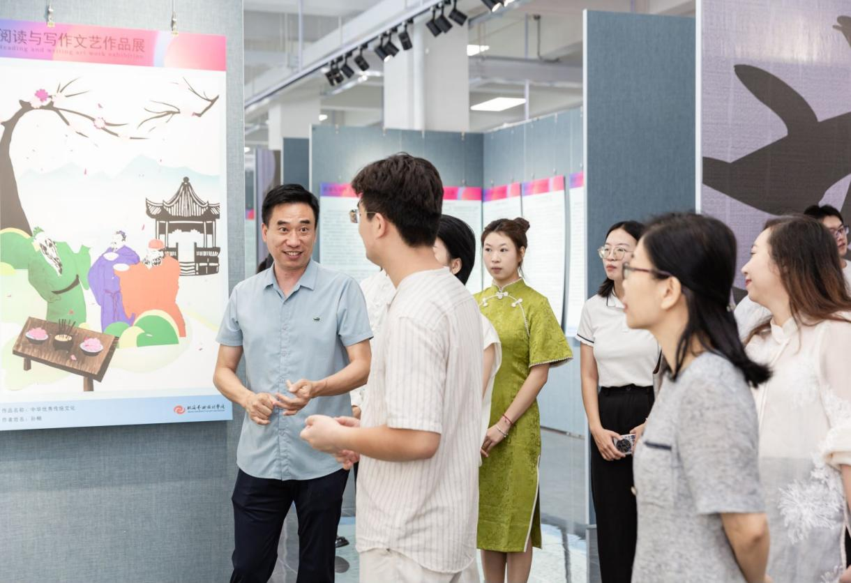 开幕式结束后,校领导与师生一同参观了展出作品。陈毅华副书记表示,此次展览是文学院的一次重要文化盛事,也是学校文化建设的重要组成部分希望广大师生能够积极参与其中,共同为校园文化建设贡献力量。这些作品中,读后感作品展现着同学们深邃而多元的思考;获奖征文作品原作以工整的书写呈现出作者充沛的情感与流淌的思想;插画作品以画笔勾勒出课文中的七彩世界,读书笔记作品则选择了一条更为内敛但同样深刻的道路来表达他们对学术的敬畏和学习的执着。