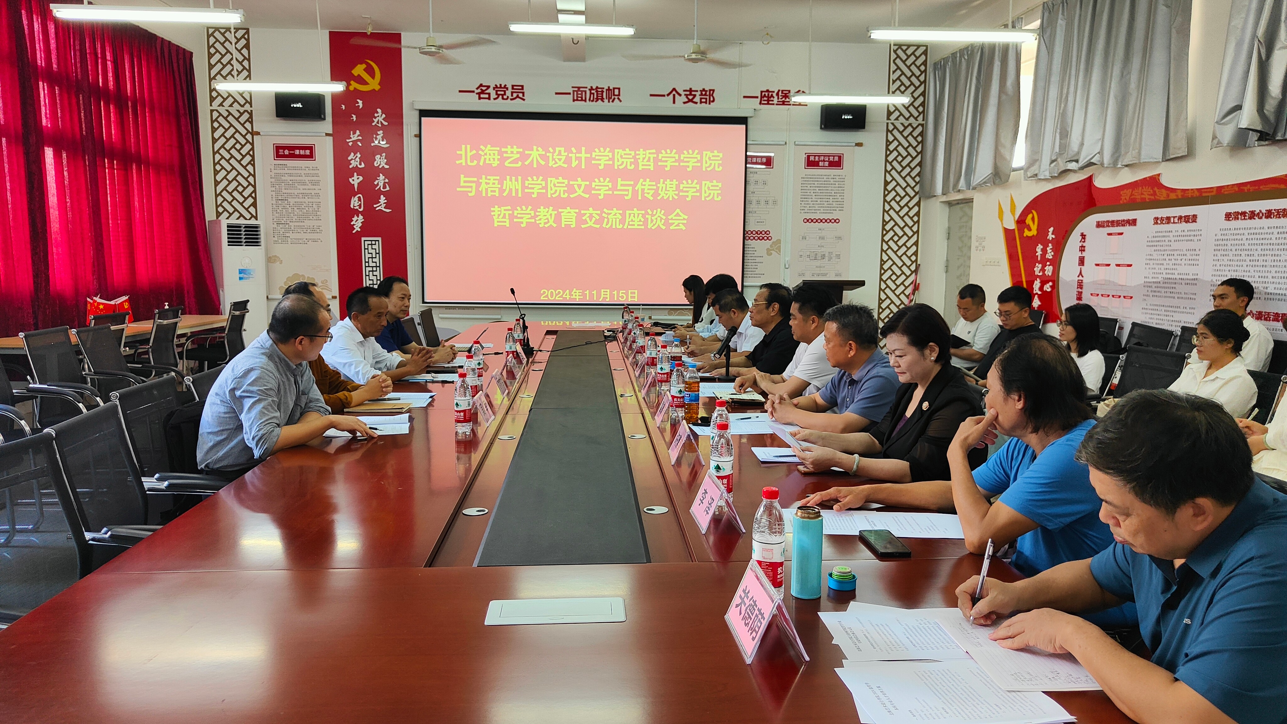 1115日下午,梧州学院马克思主义学院书记、文学与传媒学院哲学学科带头人张朝松教授等一行五人应邀出席我校哲学学院哲学教育交流会,就两校哲学专业建设与学科发展开展交流座谈。广西大学现象学与马克思主义研究所负责人雷德鹏教授以特邀嘉宾出席座谈会。我校哲学学院院长兼哲学专业学科带头人蒙绍荣教授、常务副院长李水亮、副院长蒋辉平、副院长覃传茵及哲学教研室全体专任教师参会,会议由覃传茵副院长主持。
