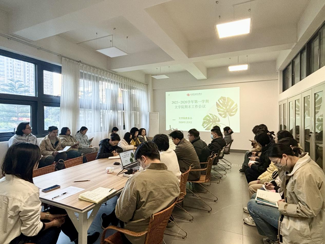 为切实做好本学期考务管理工作,保障期末考试公平、公正、有序开展,2026年1月8日,文学院组织召开期末考务工作专题会议,文学院党支部书记岳莹、副院长裴景旺及文学院全体教职工参会,教务办公室主任郭建威主持。