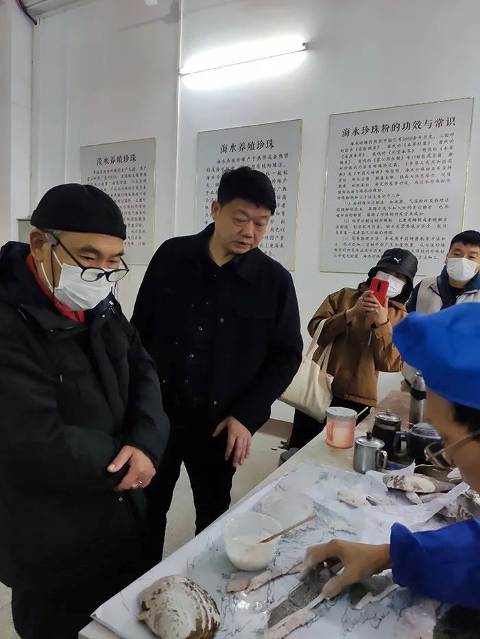 在参观过程中,当王教授得知,北海贝雕经过数年精雕细琢,已经成为代表广西的国礼和区礼,并成为北京人民大会堂、首都国际机场、国家商务部等重大场馆的重点装饰后非常高兴。王教授对当前在疫情冲击下,经济环境恶劣,恒兴珠宝公司仍然能坚守贝雕产业,并坚持不懈地传承和发展贝雕技艺表示肯定和赞赏。