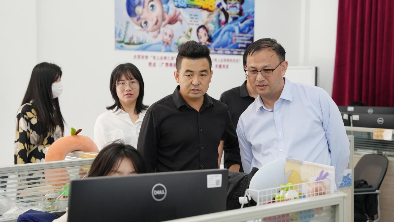 动画与传媒学院院长孙永辉引导向海金融城一行参观了动画与传媒学院实验室,并详细介绍了学院的资源设施、教学以及科研等方面的情况。他强调,动画与传媒学院一直致力于培养学生的实践能力和创新精神,并期待通过与企业合作,为该校学生提供更多的实践机会和就业渠道。