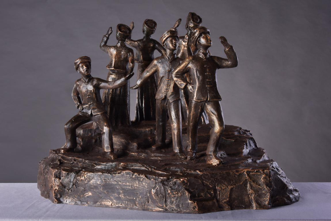 然而出乎意料的是,我们班坚持到最后居然真能做出三件紧扣题材和思想明确的艺术作品,它们分别是孙浩的《茶歌》、黄健武的《舞芦笙》和张尧的《那山那歌》,这三件作品光草图就被我否定了十次有余,泥稿更是耗时两个月。再到玻璃钢翻模,最后上色,他们都表现出了惊人的毅力。