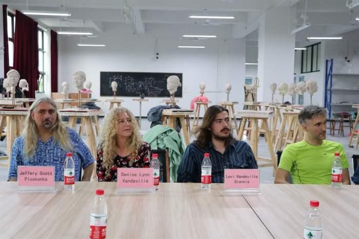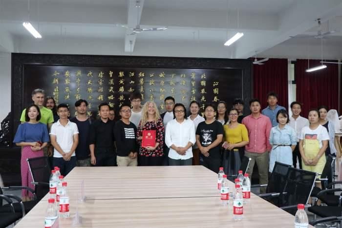 美国芬兰迪亚大学校长 DeniseL.Vandeville(丹妮丝·范德维尔)、教师 Jeffry Scott Ploskonka、教师 Levi Vandeville Grannis 等贵宾,与我校副校长胡胜、美术学院副院长成斌、美术学院副院长龚为、美术学院副院长唐海以及我校美术学院全体教师共同参与颁发聘书仪式