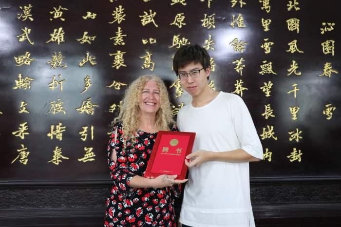 活动结尾,DeniseL.Vandeville(丹妮丝·范德维尔)校长手拿证书同在场所有教职人员 拍照留念,此次活动圆满结束。 (金凯靖 摄)