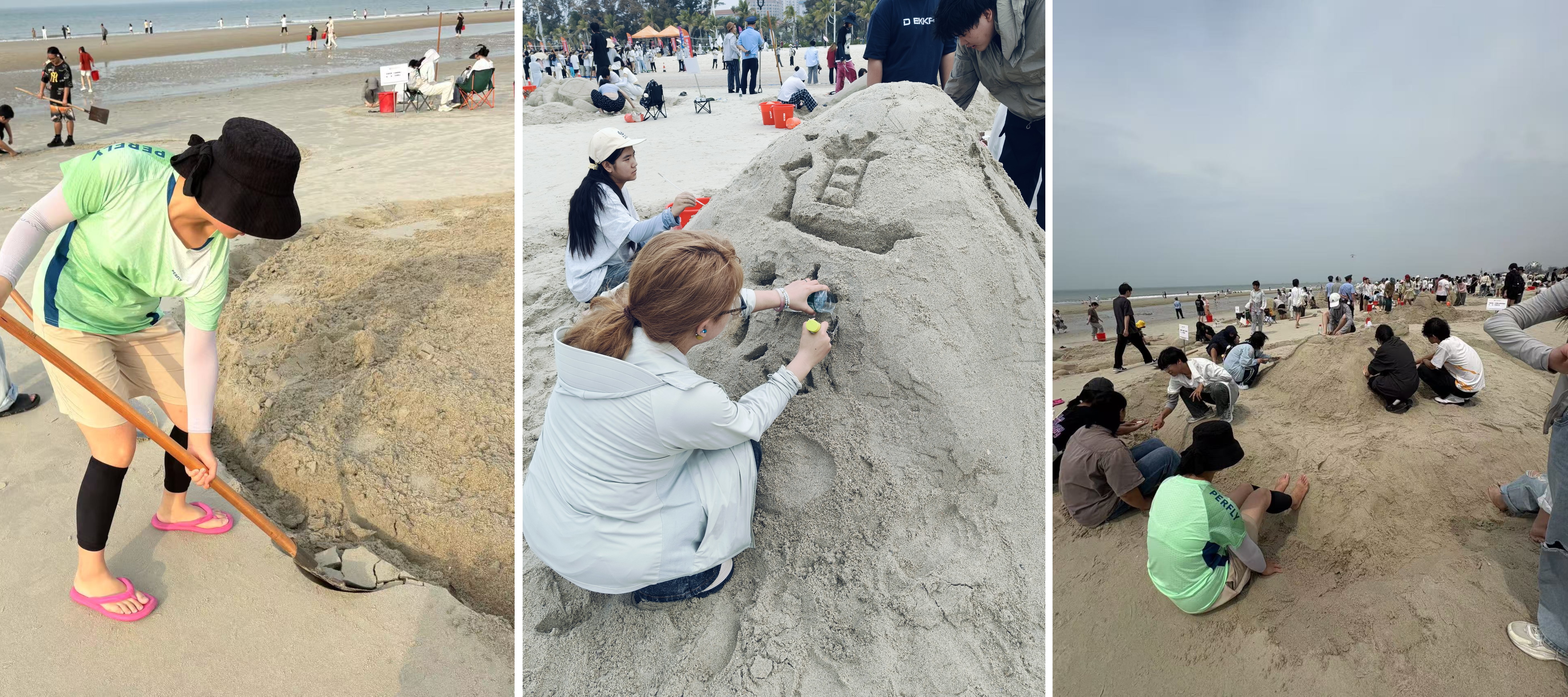 在沙滩排球赛场上,白色排球在蔚蓝天空与金色沙滩间穿梭,每一次精彩攻防都引发观众阵阵喝彩,水到渠成比赛考验团队默契,书法学院队员们手持U型槽,小心翼翼传递着水源。沙雕选手们更是巨型铲子、小水桶、雕刻刀等工具齐上阵,潮湿的沙粒在手中逐渐成型。还有同舟共济、袋鼠跳、巨人脚步等趣味项目,展现了书法学院学子在此次沙滩运动会中的运动活力。