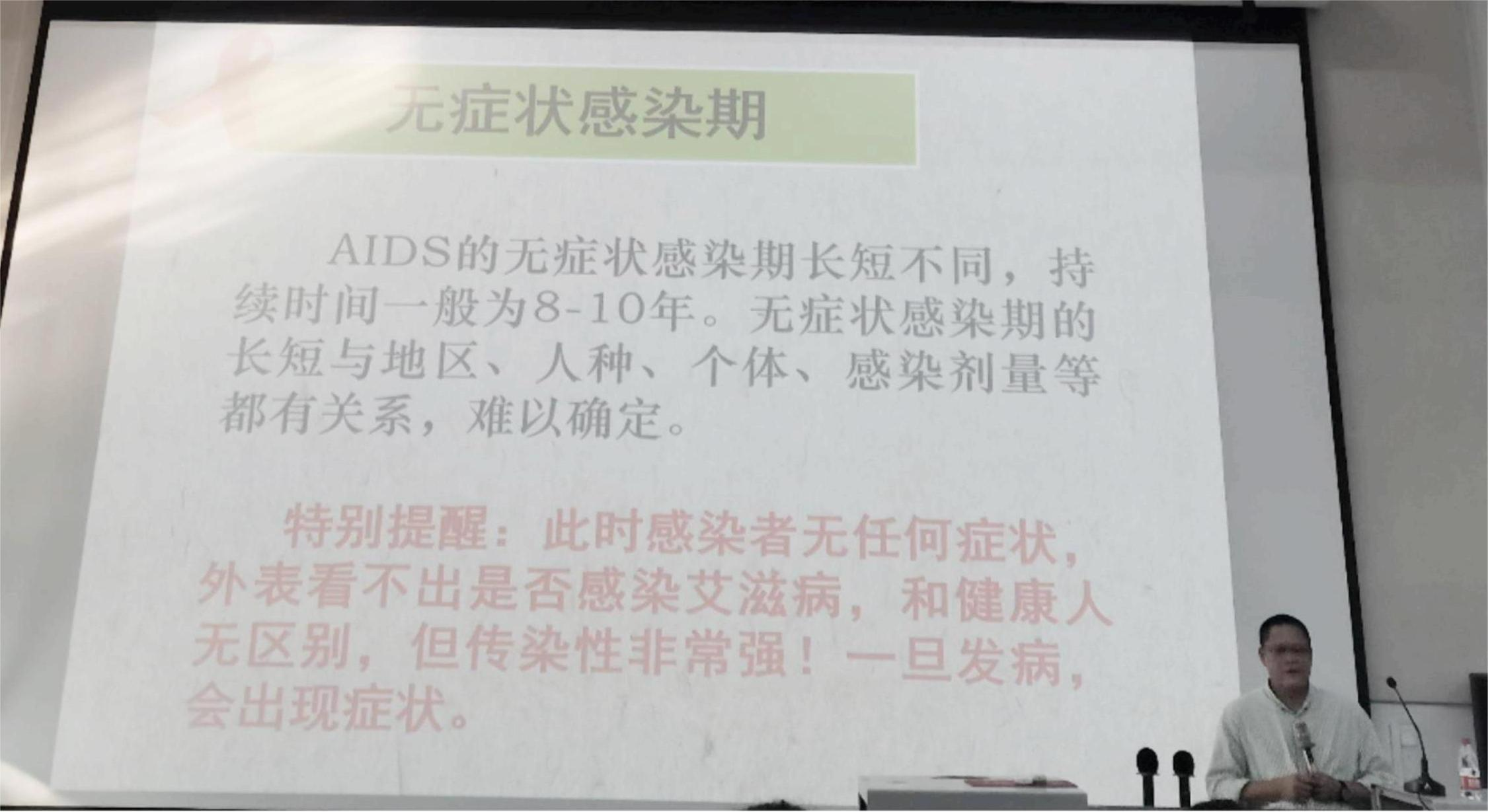 预防艾滋病最为重要的一个环节就是正确认识艾滋病,同时了解如何防治艾滋病。廖医生从艾滋病的流行现状、艾滋病的分期及主要症状、艾滋病的传染源和传播途径、艾滋病的危害和预防措施等几方面为大家深入浅出地讲解了艾滋病的相关知识,并通过模具演示和脱敏训练让大家对安全套的正确使用有一个更清晰的了解。