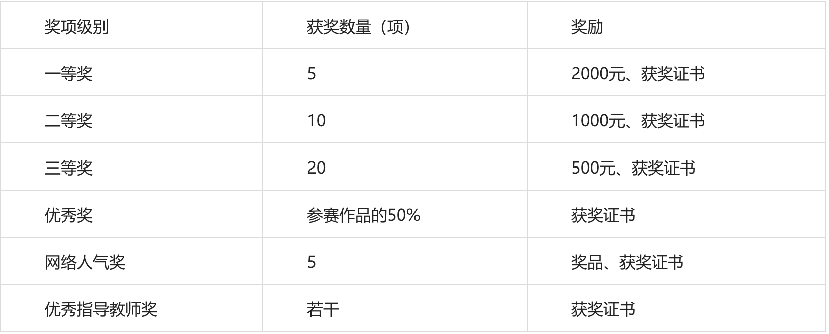 (四)网评:复评结束后将开启网络人气奖评选通道,学校将通过复评的作品进行公开网络投票,共评选出5项网络人气奖。
