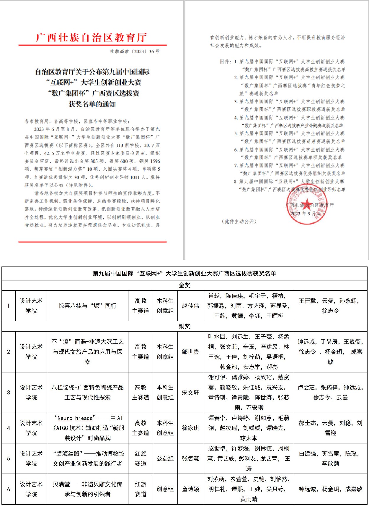 近日,广西壮族自治区教育厅发文公布了第九届中国国际“互联网+”大学生创新创业大赛“数广集团杯”广西赛区选拔赛获奖名单,我斩获奖项6项,其中,项目《惊喜八桂与“坭”同行》斩获自治区级金奖,其它晋级区赛的5个项目荣获自治区级铜奖。据悉,本届大赛广西赛区选拔赛共有113所院校、近20.7万个项目报名参赛。其中66所院校516个项目入围区赛现场总决赛。