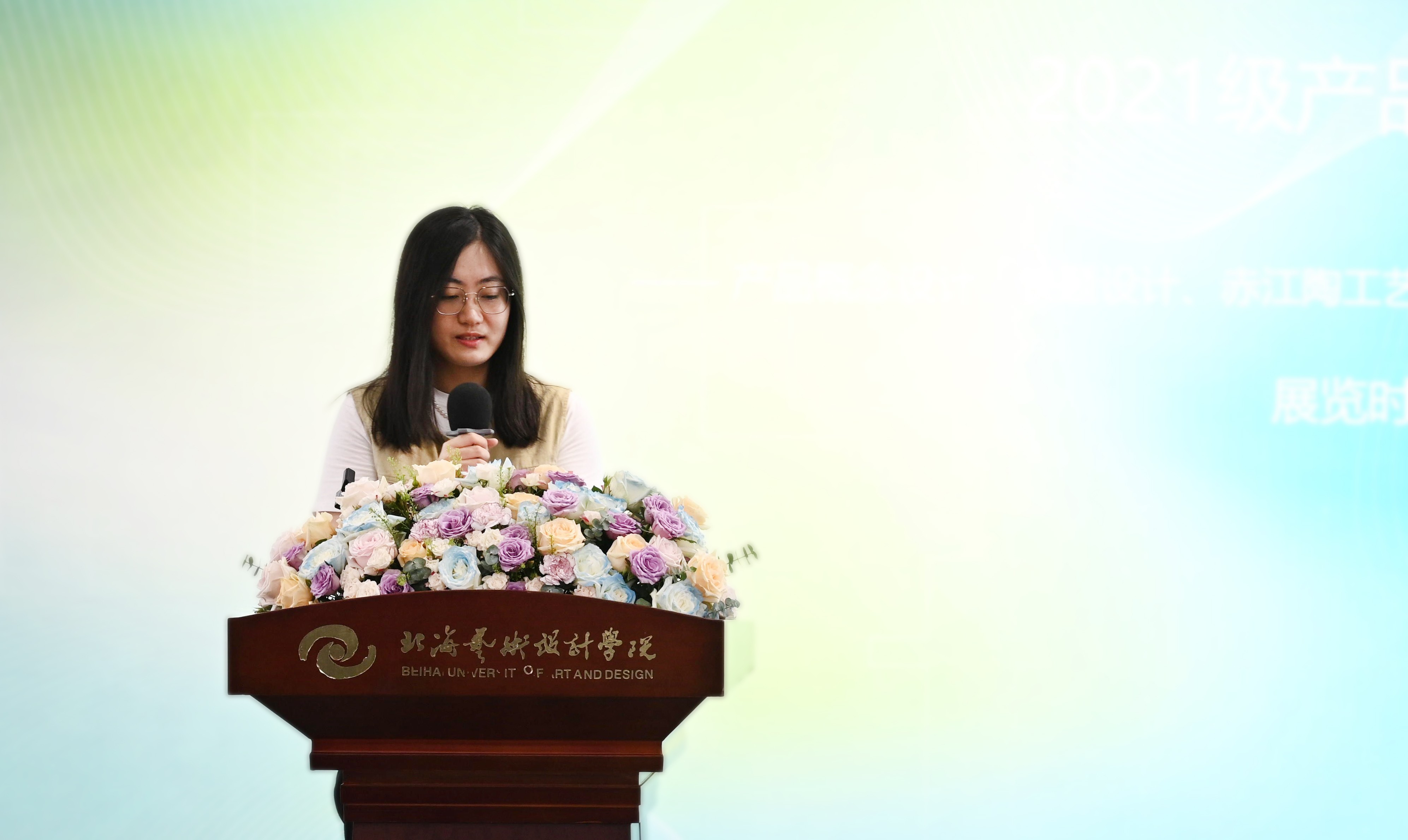 学生代表颜晓敏在发言中感谢学校提供了展示才华与学习交流的平台以及指导老师们的悉心指导与无私付出,并分享了本次课程作业展深刻感受,认为通过不断地丰富设计理论知识,将所学应用于实际设计实践中,拓展设计视野,才能逐渐提高设计水平。她坚信,这样的学习过程和锻炼机会对于每一位产品设计专业的学生来说都是极其宝贵的。
