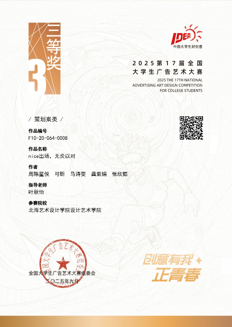 近日,第十七届全国大学生广告艺术设计大赛获奖名单揭晓,在我院师生共同努力下,共获得55个奖项,其中全国三等奖1项,全国优秀奖12项,省级一等奖6项,省级二等奖12项,省级三等奖24项。