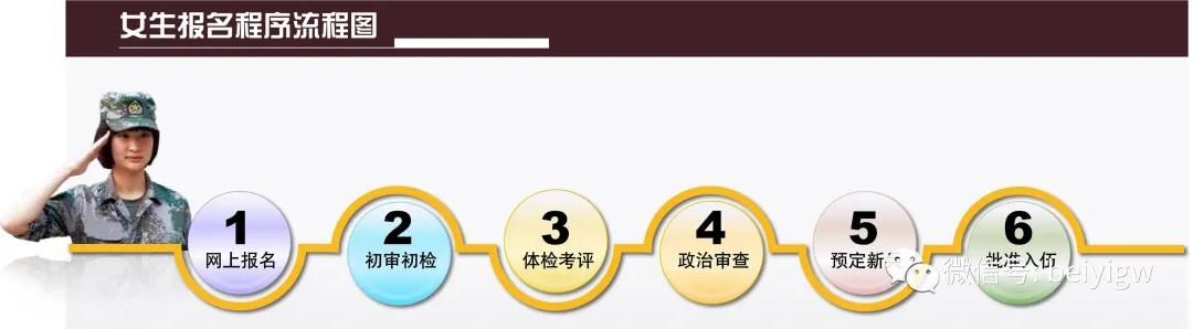 参加网上报名和择优初选预征对象:8月5日前,女生登录“全国征兵网”参加网上报名(http://www.gfbzb.gov.cn)。报名结束后,征兵网将自动依据报名人员当年高考相对分数由高到低的顺序,依次确定初选预征对象。被确定为初选预征对象的女青年,8月6日起登录“全国征兵网”,自行打印《应征女青年网上报名审核表》。大学毕业生和在校生自行打印《大学生预征对象登记表》《高校学生应征入伍学费补偿国家助学贷款代偿申请表》,并交学校征兵工作站审核盖章(已放假离校的学生可直接交应征地县级征兵办公室先期审核)。