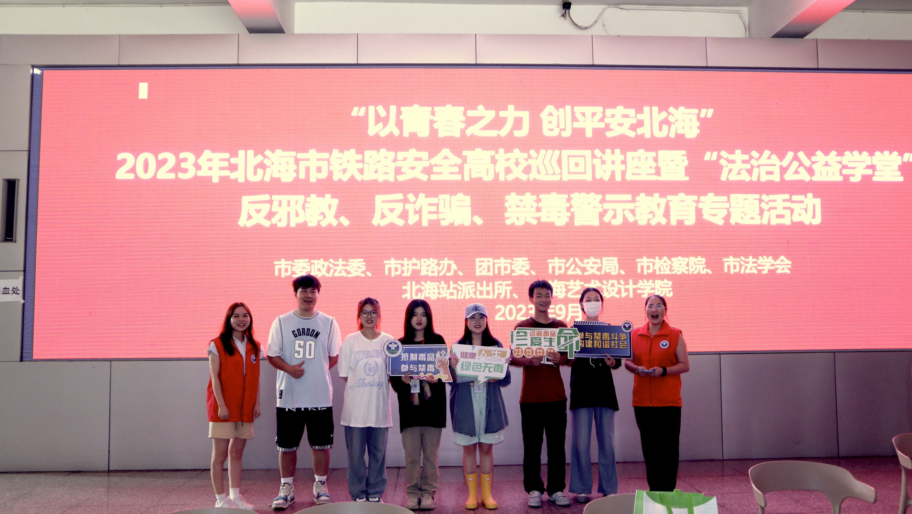 为进一步提升全体师生的安全意识和防范能力,增强铁路安全、爱路护路意识,提高反电诈、禁毒等意识,2023年9月27日下午,市委政法委、市护路办拟联合市公安局、团市委、市法学会、北海铁路公安处于我校西校区大礼堂,开展了“以青春之力 创平安北海”北海市铁路安全高校巡回讲座暨“法治公益课堂”反邪教、反诈骗、禁毒警示教育专题活动。