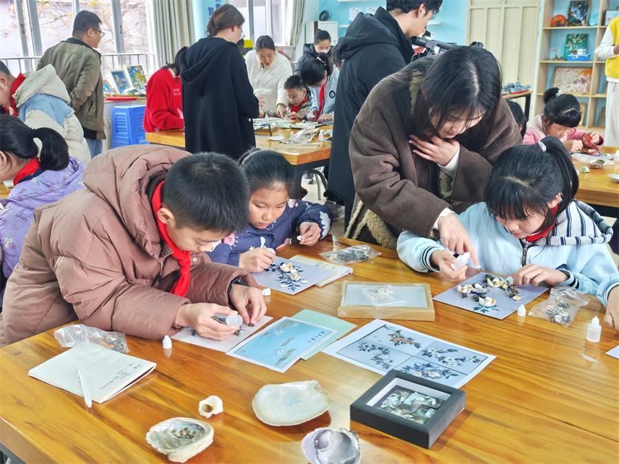 在互动体验环节,我校产品设计专业四名学生担任起了“非遗小教师”的角色,在他们的耐心指导下,学生们热情高涨,纷纷拿起贝壳和工具,依据贝壳形状精心构思图案,开启创作之旅。不一会儿,一幅幅充满童趣的贝雕作品诞生,展现了学生们的奇思妙想,更承载着他们对传统文化的理解和热爱。