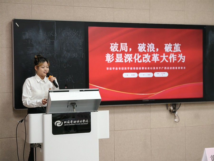 书法学院党支部副书记左云飞在总结讲话中充分肯定了此次比赛的组织成效与选手表现。他指出,活动将理论宣讲与专业特色深度融合,有效提升了理论学习的吸引力与感染力。他寄语全体同学,要持续加强理论学习,做到学以致用、用以促学,主动肩负文化传播使命,以青春之声讲好中国故事。