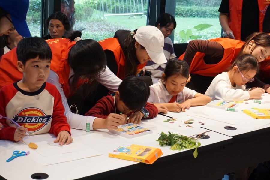 “亲子绘画”环节在社区共享会议室温馨开启。传媒艺术学院的志愿者们充分发挥专业特长,化身“艺术导师”,耐心引导小朋友们展开想象,在洁白的画纸上共同描绘秋天的故事。孩子们在志愿者一对一陪伴下,以“我眼中的秋天”为主题,挥洒童真色彩——金黄的落叶、高远的蓝天、欢笑的家人、嬉戏的身影……一幅幅充满生命力的图景在画笔下渐次绽放,现场化作一片流动的色彩海洋,洋溢着童趣与温暖的创作气息。