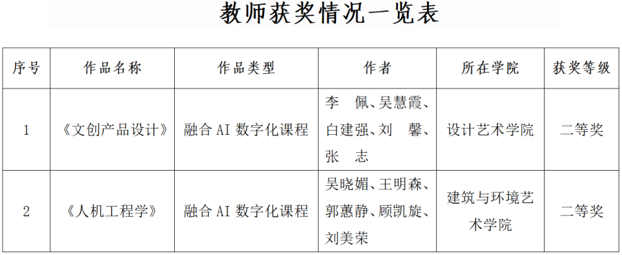 近日,自治区教育厅公布了第二十四届广西高校教育教学数字化大赛获奖名单,我校设计艺术学院李佩教师团队的作品《文创产品设计》和建筑与环境艺术学院吴晓媚教师团队的作品《人机工程学》荣获融合AI数字化课程组二等奖。