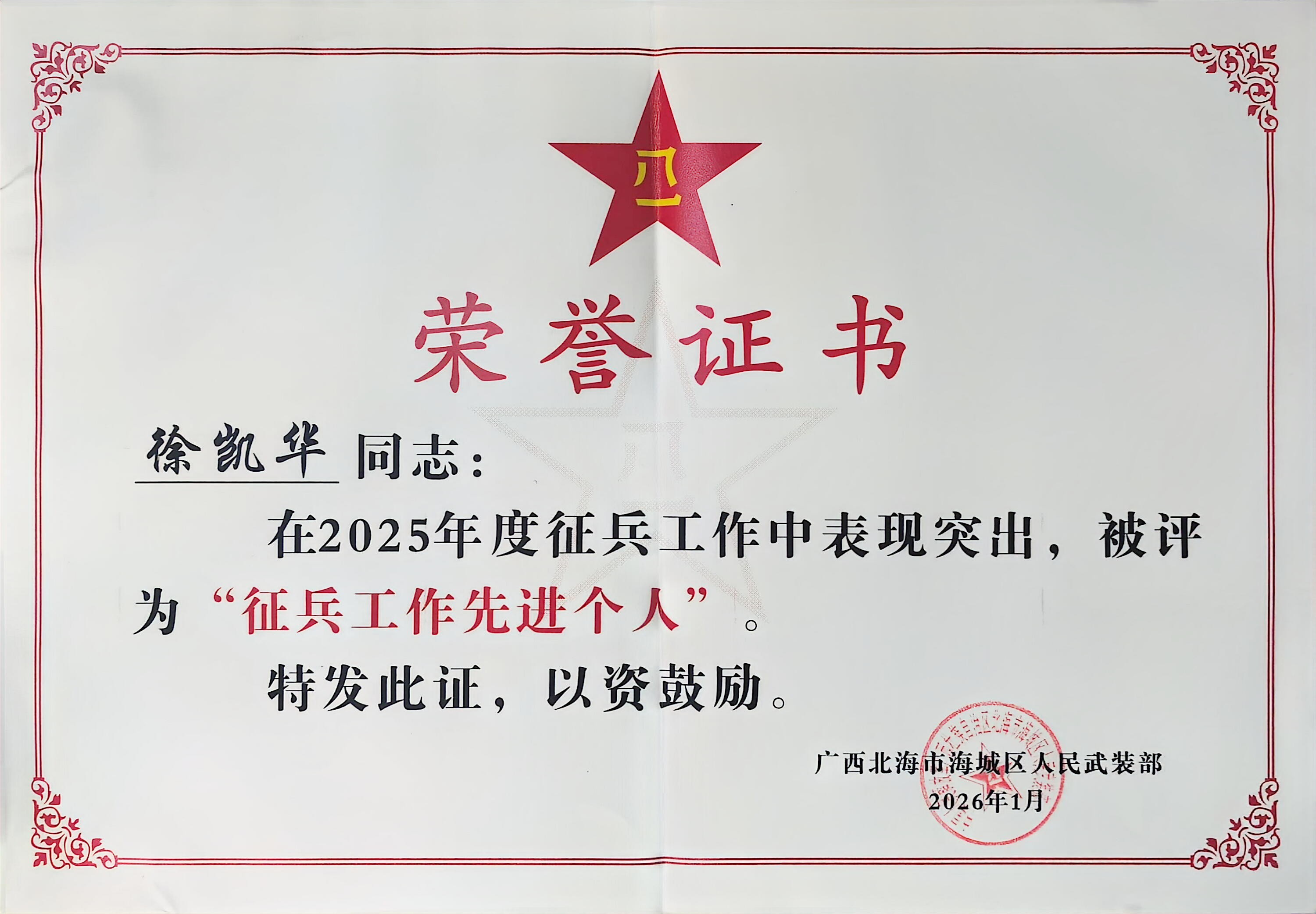 近日,北海市海城区人民武装部对2025年度征兵工作先进单位和个人进行表彰。我校荣获海城区“征兵工作先进单位”称号,我校教师徐凯华荣获“征兵工作先进个人”称号。
