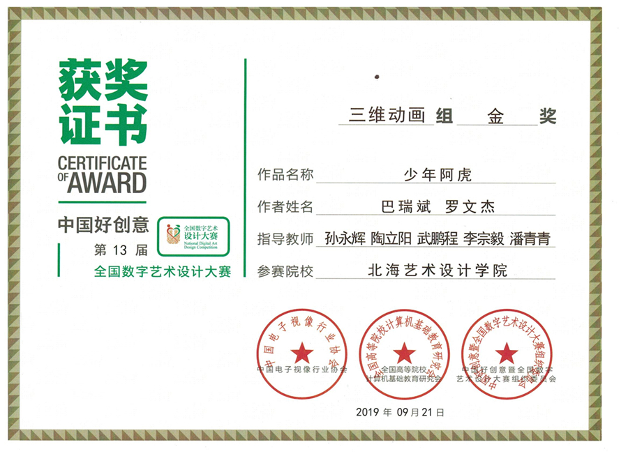 第十三届中国好创意全国数字艺术设计大赛颁奖盛典于2019年10月24日至10月28日在杭州浙江工业大学成功举行。动画学院在众多参赛作品中脱颖而出,共获得了1金1铜的好成绩。