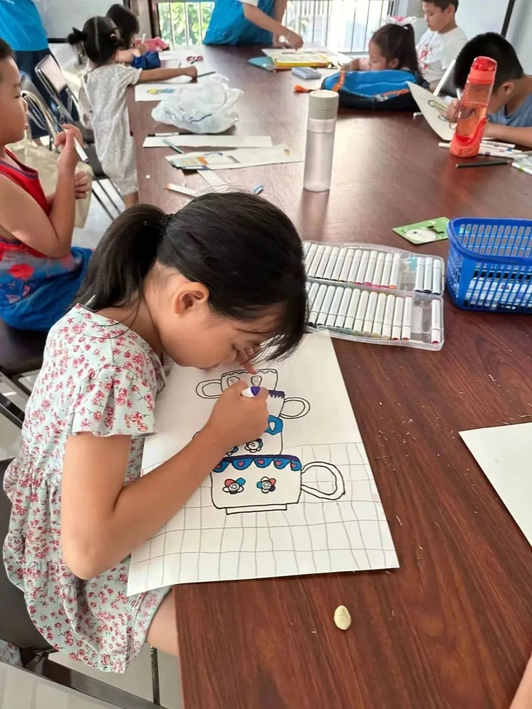 在北部湾社区,志愿者们用绘画和剪纸相结合的方式,教会孩子们做出以“杯子”为主题的作品。孩子们有的用水彩笔,有的用油画棒,他们都在用自己最喜欢的方式,用自己最熟悉的工具,一步一步创造出具有自己风格的作品。别看这小小一幅画,这可是孩子们用心的成果,他们看着自己的画作,露出了满意的笑容。