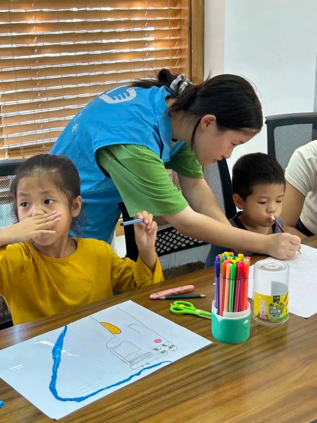 先来看看本周的绘画课堂,本次要教授的画作名为《爱刷牙的鳄鱼宝宝》。在前期备课环节,志愿者精心选择课题,耐心完成教案,用心完成画作。在上课过程中,孩子们十分配合,课堂氛围和谐融洽,孩子们坚持不懂就问,在志愿者的指导下,他们用画笔一笔一笔勾勒出属于自己的小“鳄鱼”。